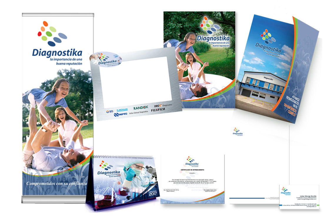 Diagnostika S.A.:Empresa de alta tecnología en diagnóstico clínico, nos ha permitido manejar su Imagen Corporativa, en todos sus aspectos, desde crear su Libro de Marca con sus aplicaciones, remodelar su edificio actual y hasta organizar sus Lanzamientos de productos y stands.